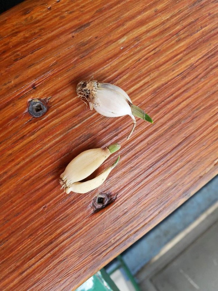 SOMEHOW I had left the clump of dried tops and tiny garlic on the porch.
