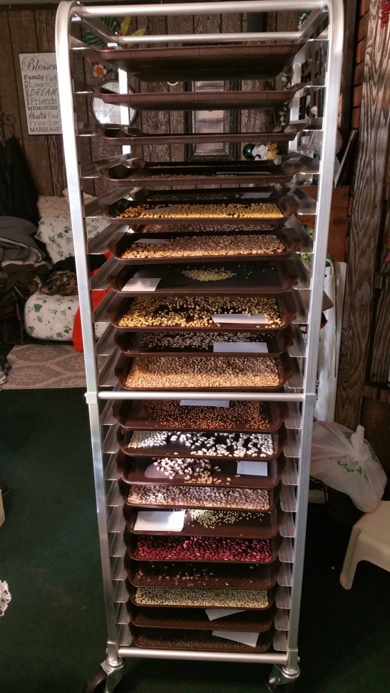 This rack will hold 2 small trays per shelf, for a total of 40 trays. It won't hold everything most years (14 more trays didn't fit), but it will offer easy access for seeds while harvest is still ongoing.