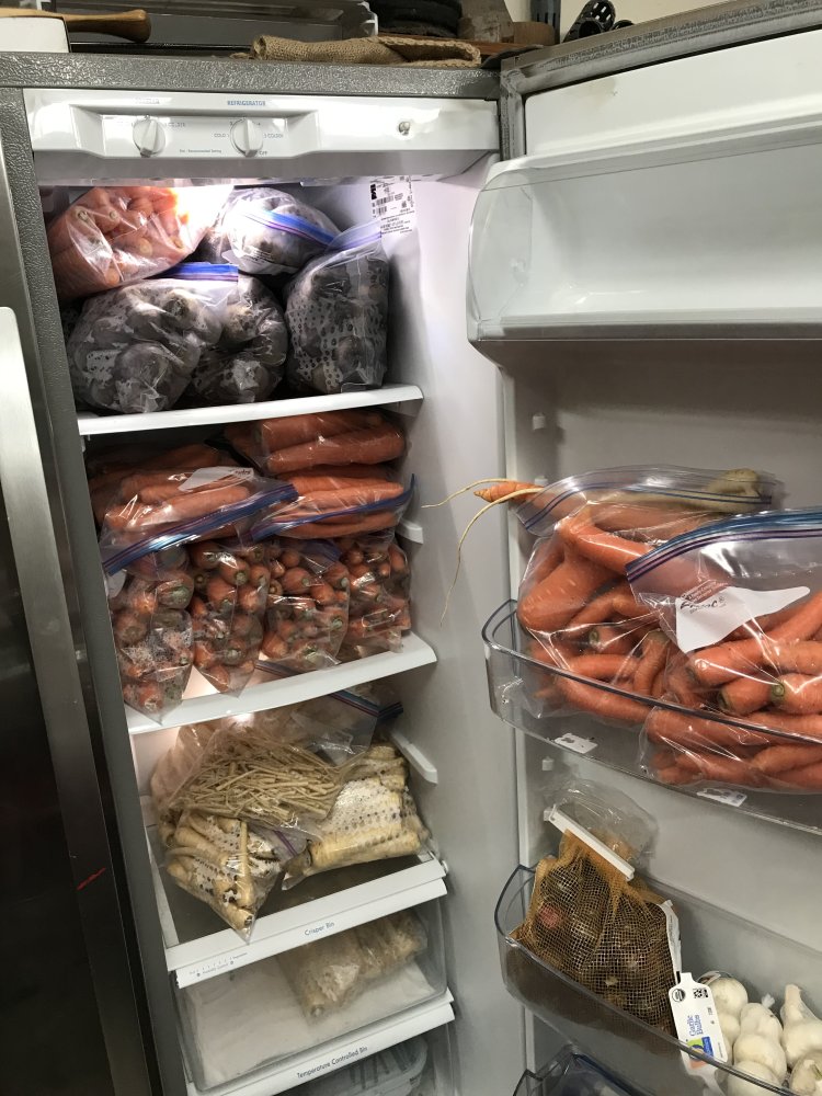 in another month they will be jammed full of produce! This one (from last year) holds the Carrots, Parsnips. Beets etc. Another one will have 2 shelves for pickles and Kraut in the door, along with Apples and other soft fruit in season.