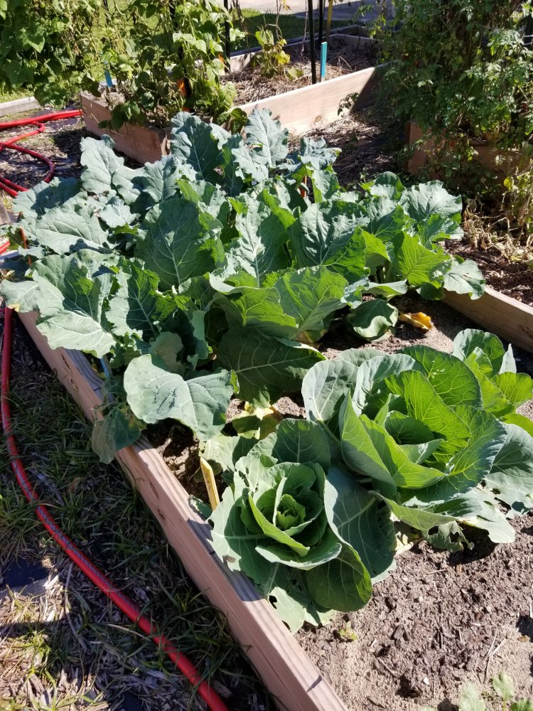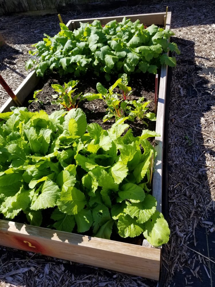 Mustard Greens in the front, some tiny Chard, then Turnip Greens, then something hidden in the back I can't remember. It's rough getting old. Oh, yeah, lettuce. I'll have turnip greens for supper tonight.