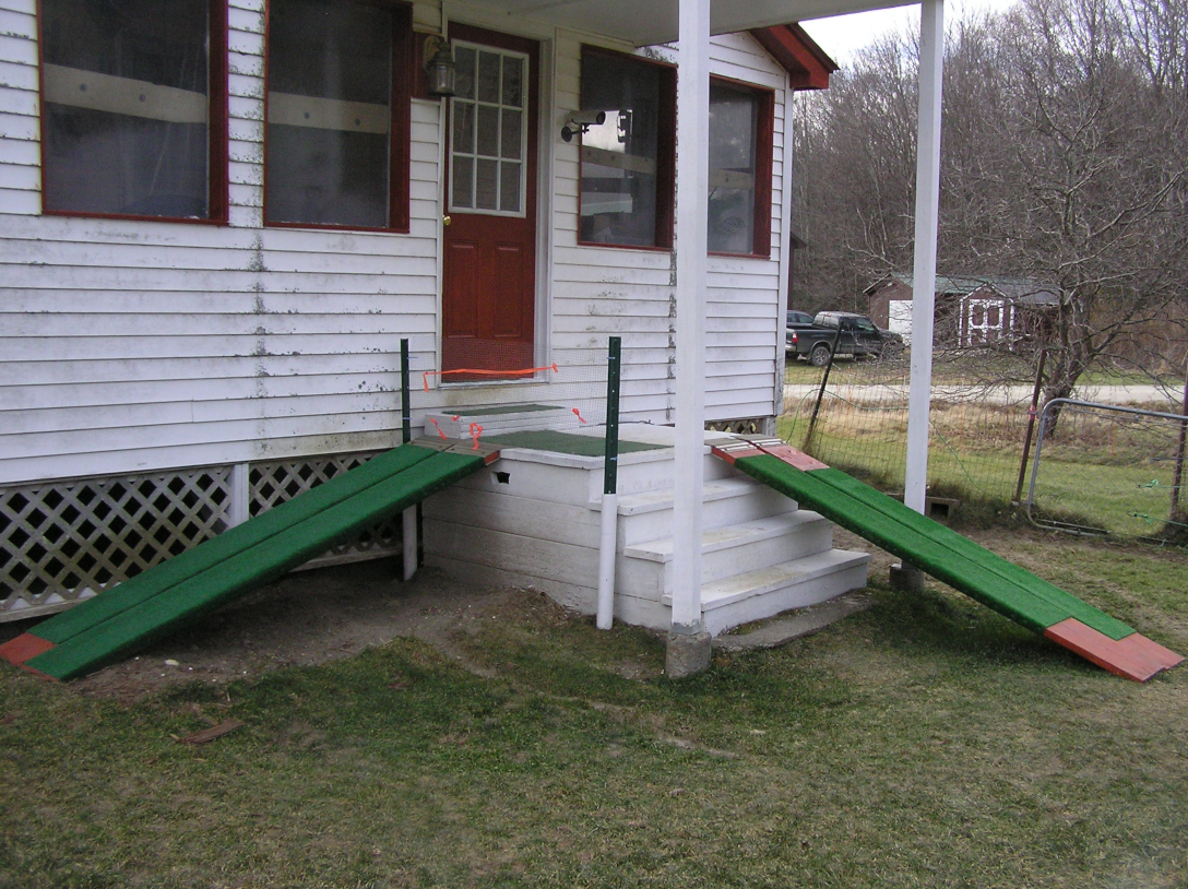 To explain: These are 2 photos of the summer configuration of the ramps leading off the back porch. Each of these 4 ramp parts is approximately 12 inches wide. Mabel happily goes down and up these ramps.