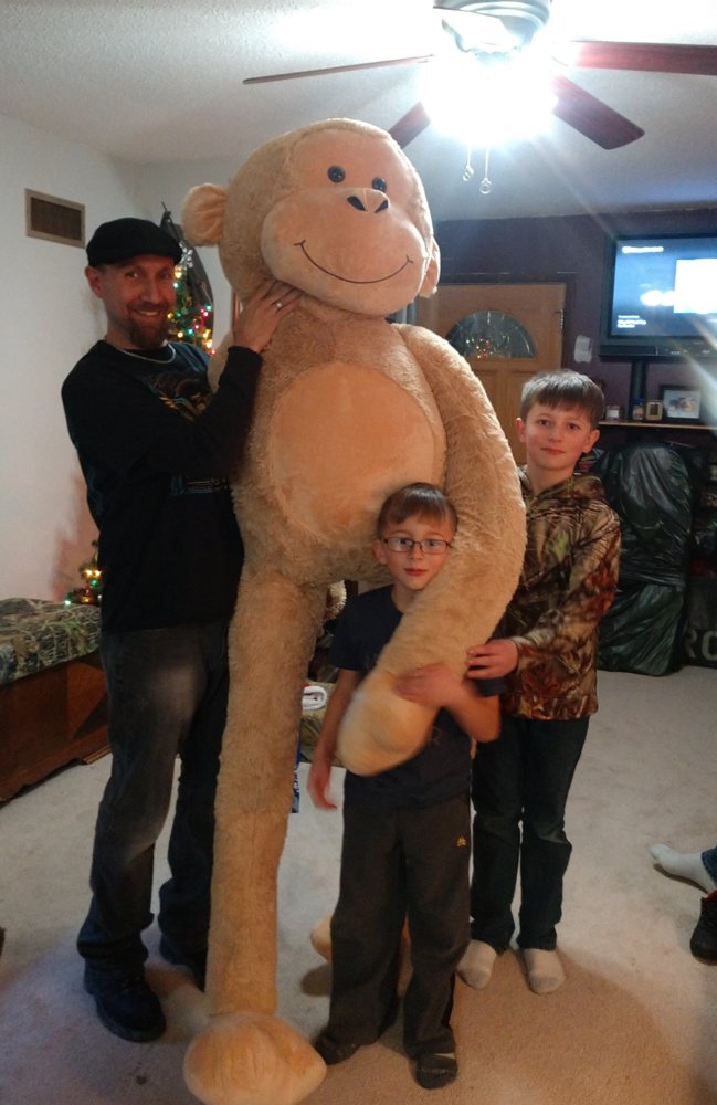 My Oldest son, Uncle Monkey to these two, bought the youngest one this MONKEY for his 8th birthday. The crazy thing must be 7 feet tall!