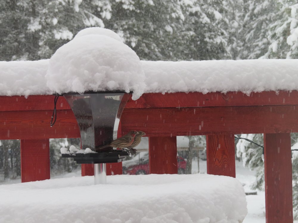 And from those of us who don't have a white Christmas and are NOT missing it, thank you.Merry Christmas! Here's a little white stuff (with my house finches chowing down) for those that are missing the White Christmas...