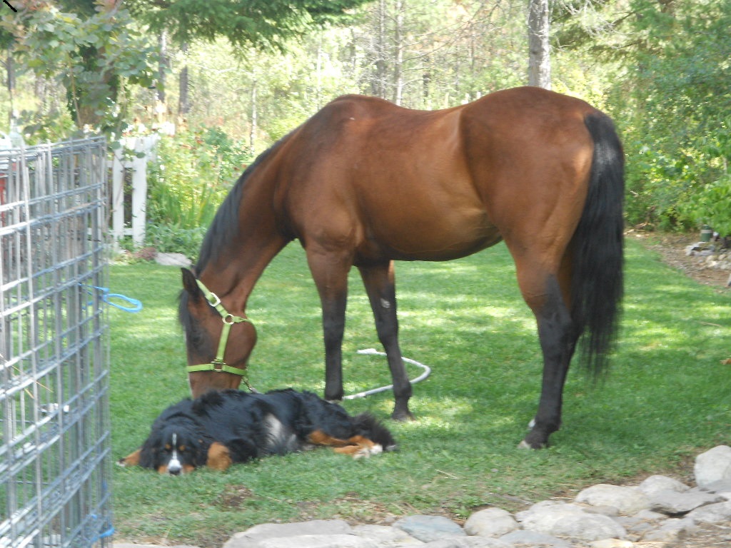 Here's Luke and my dog Larka. She was laying near a feed bowl she had carried to the lawn. She was making sure she'd beat the horse to any scraps that came out of the house and ended up there.
