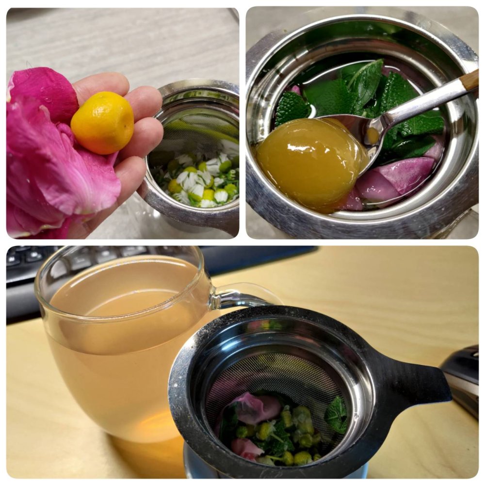 Tea for this morning - chamomiles, rose, calamondin juice, sage, mint, and honey