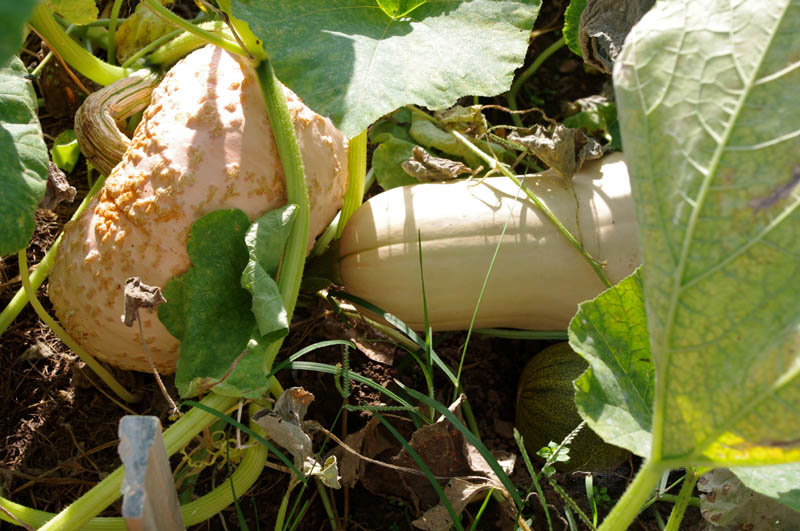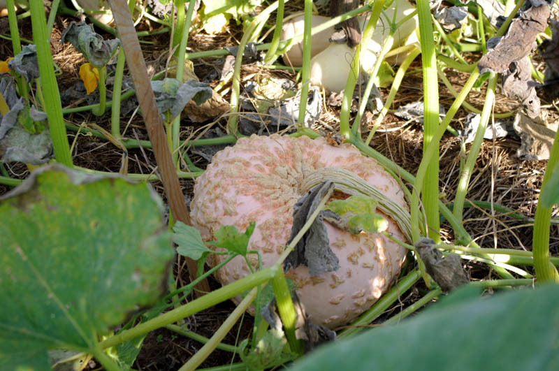 The leaves are starting to die back in the pumpkin patch and reveal the goodies that have been hiding. I had written down what all I planted in there, but now I can't find the list. If I remember right, there was 'Big Moon' Pumpkins, Waltham butternut squash, Cushaw squash, Jumbo Pink Banana squash, Galeux d'Eysines ("peanut pumpkin") squash, Athena and one other type of cantaloupe, Crimson Sweet watermelon (don't think they did anything, overshadowed by the pumpkins) and Ananas D'Amerique A Chair Verte Melon (freebie from Baker Creek order, kinda like a honeydew) and there is one other green melon in there that somebody gave me and I forget now what it was.