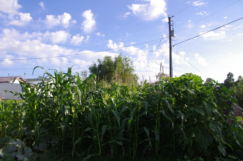 Second planting of corn and mixed sunflowers in that blank spot I was holding have grown so fast, literally before my eyes. The Painted Mountain corn and the sweet corn of course tasseled at the same time and I was forced to cut the tassels off the PM. Felt like a betrayal. :\ But the sweet corn will be more useful for us.