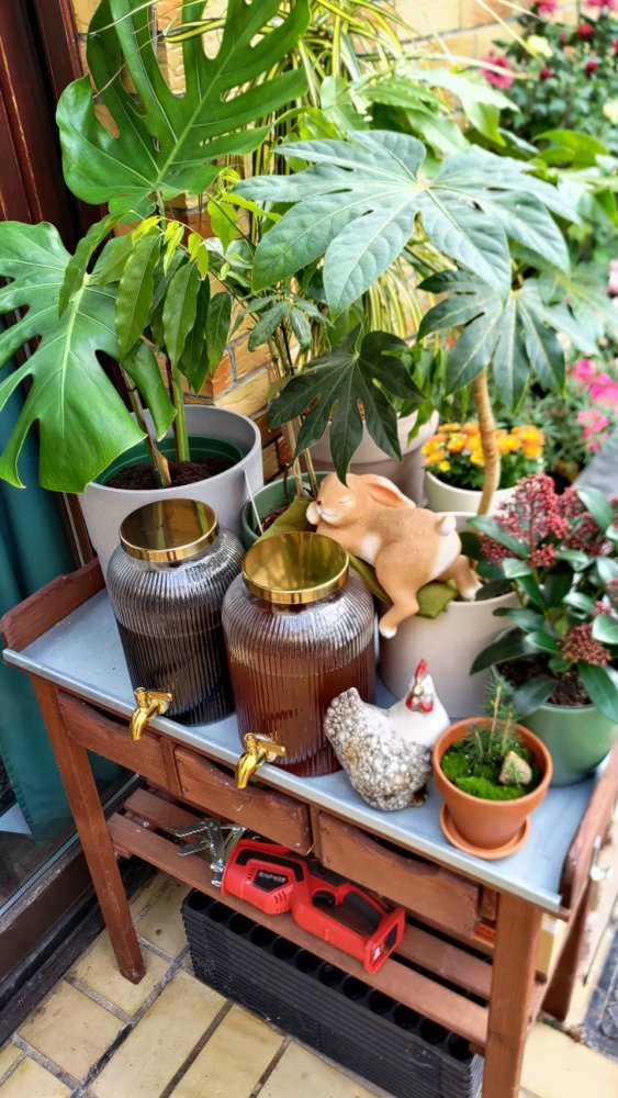 It was my first potting table, and I bought it right after we bought the house. Unfortunately, it's obviously too small to support so many things I want to do on it. So, this year, I bought a much bigger stainless steel table (originally used for commercial kitchens). I wasn't sure what to do with this very small table until I found the glass dispensers I liked last month.