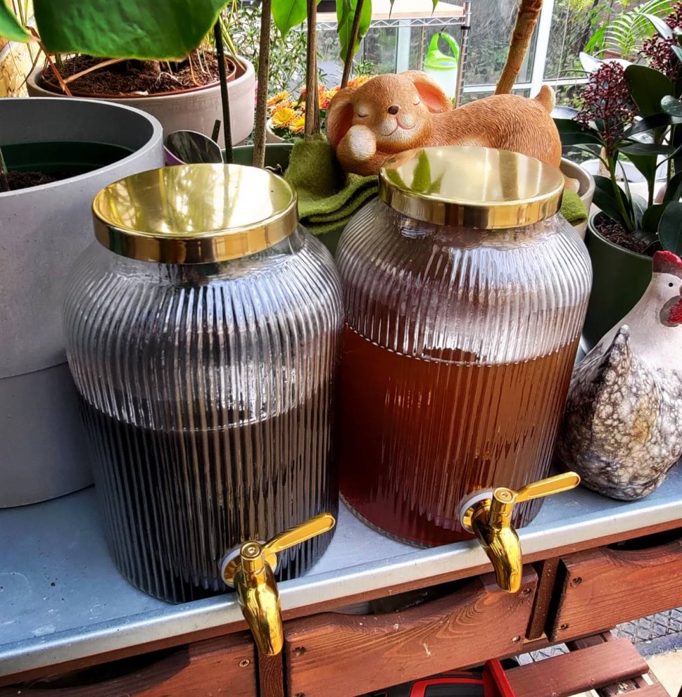 One is seaweed fertilizer, and the other is the homemade Eco Enzyme (or garbage enzyme). Both were diluted already and could be easily filled into any watering container (and would be further diluted again).