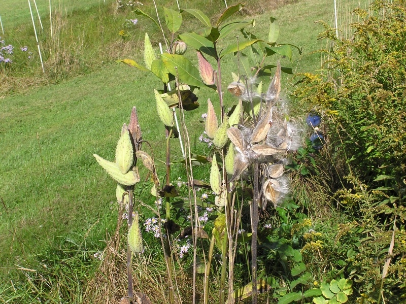 Thank you very much for the kind offer of seeds, but I'm sort of afraid of the other varieties, since I've heard that monarchs attempt to lay their eggs on these plants and the caterpillars do not survive. I expect that this year both the milkweed and monarch populations are going to be suffering here. Seed production as seen above won't be happening this year.