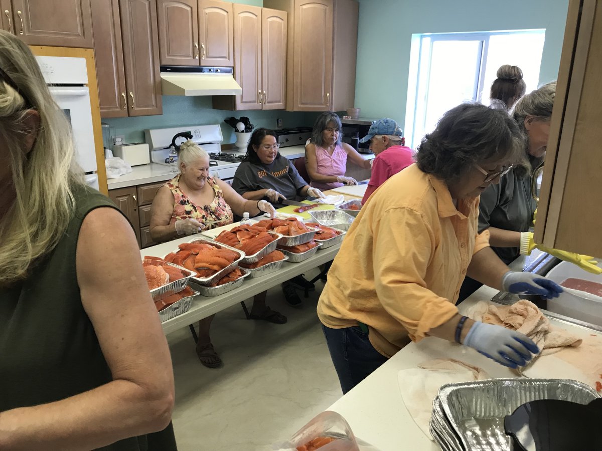 One fellow outside emptying and sorting coolers into trays that are put thru the window to the army of women inside; who reduce the fillets to fit in the vacuum seal bags. Others pat them dry and put them in the bags. Then they come thru another window to me and another fellow who stand there running a pair of commercial vacuum sealers. Bagged fish are then sent to a pair of chest freezers for storage. Along the way Workers are encouraged to take all the Salmon they want for the year and the remainder find homes thru the food bank.