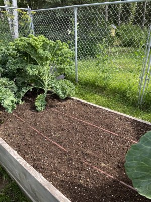 The far bed contains Horse radish, Self Heal and Rhodiola. The near bed is being populated with Cilantro, Lettuce, Kale etc.