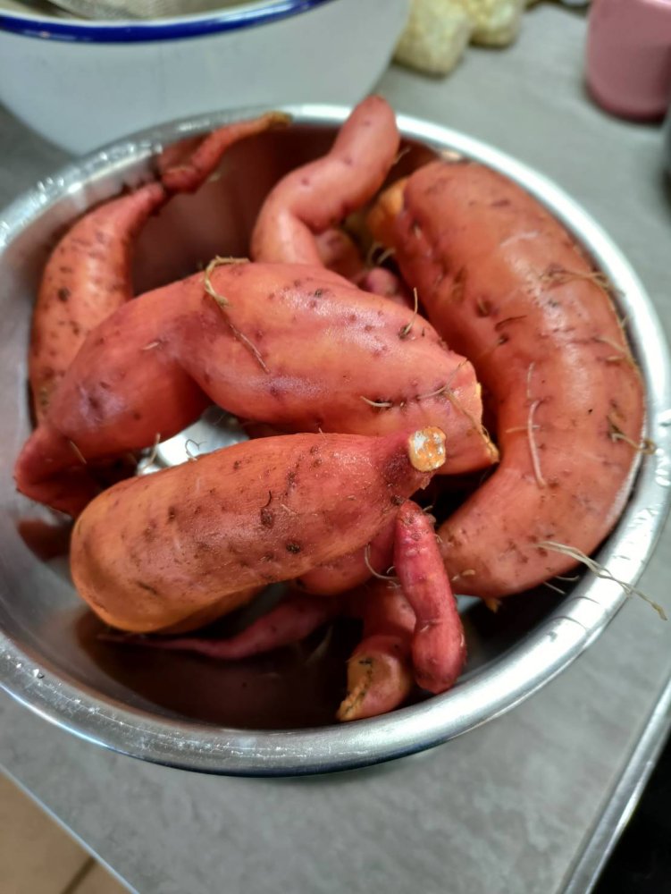I didn't expect sweet potatoes this year because the summer is too cold; however, they look delicious.