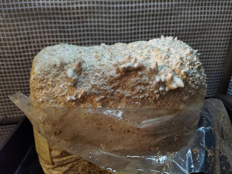 I put this king oyster mushroom block and two shiitake blocks at the same time. Shiitake blocks already gave us the first harvest and entered the resting phase. Then finally, the king oyster one started slowly to fruit.