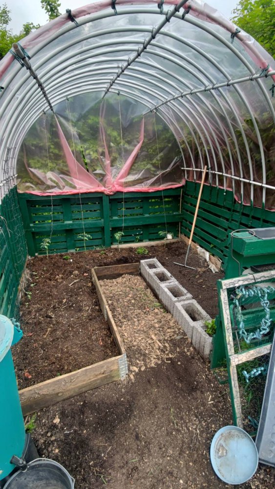I also finished the mini hoop tunnel for tomatoes. Next week, I might modify it into a raised-bed type hoop tunnel by adding some wooden plates on the front. When we have more pallets, we can also keep expanding it.