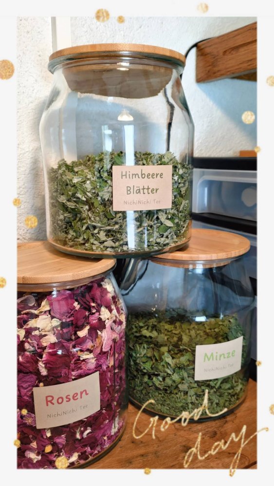 The lemon balm leaves I collected on Monday are fully dried, so I ground and stored them in a jar. Then, I picked again some sage, mint, and raspberry leaves.