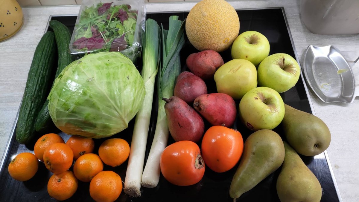 DH has his home office today because tomorrow is their Christmas party. So, we went for routine grocery this morning and brought back two 3-Euro bags as usual. I can't think about a better way to spend such 6 Euros.
