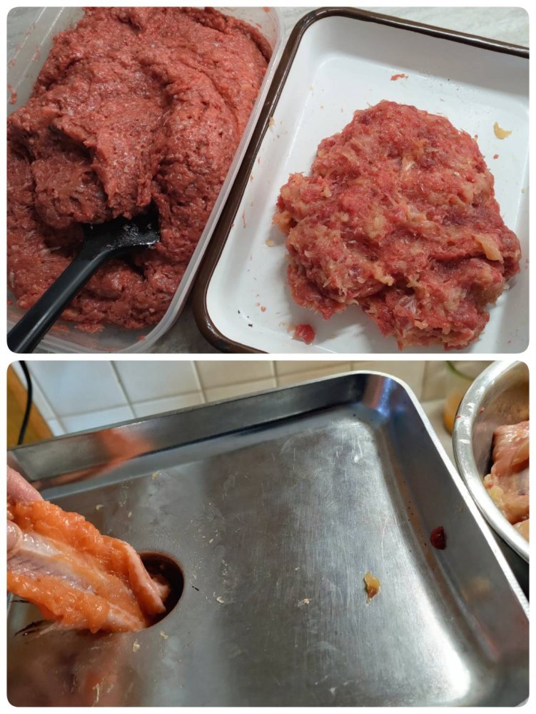 Yesterday, I processed a salmon trout and a chicken. All the trimmings, fish head, tails, and bones were sent to the grinder and became a kind of paste in two minutes.