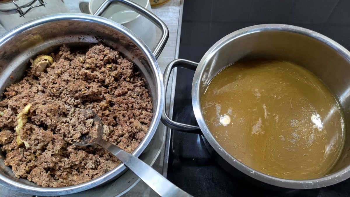 This morning, I steamed the paste and got a decent protein and calcium supplement for dogs, hens, and quails. The steamed "meat loaf" has a loose and fine texture, pretty safe for the animals. Besides, the soup underneath also looks great.