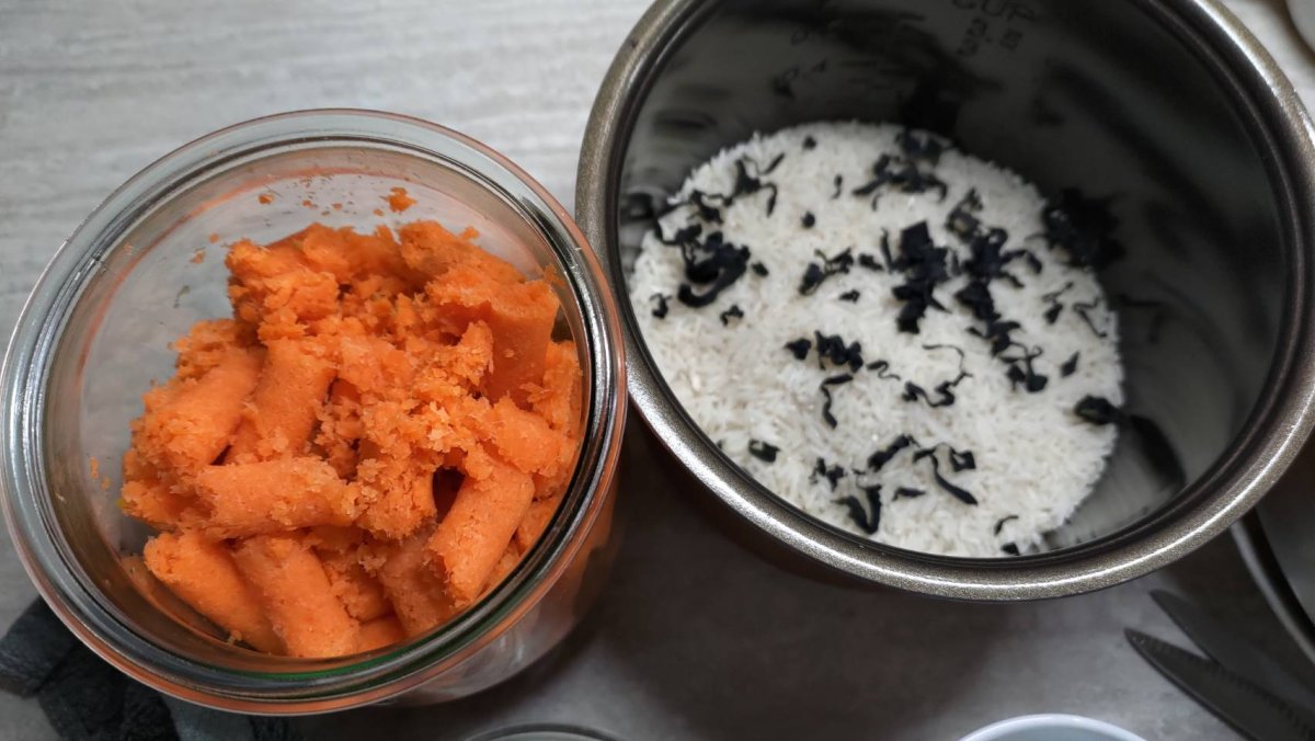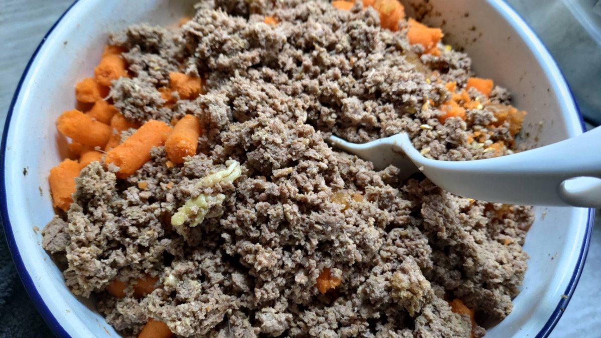 I have some leftover carrot and apple (after making juice) in the fridge, so I used them to make some food for two dogs first.