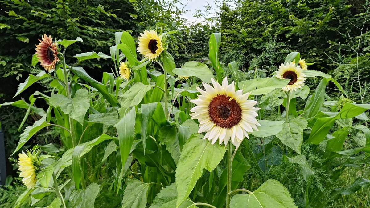 I grow sunflowers and corns together, and among them, the 2nd batch of sweet peas - my idea is, sweet peas can use either as the support to climb.