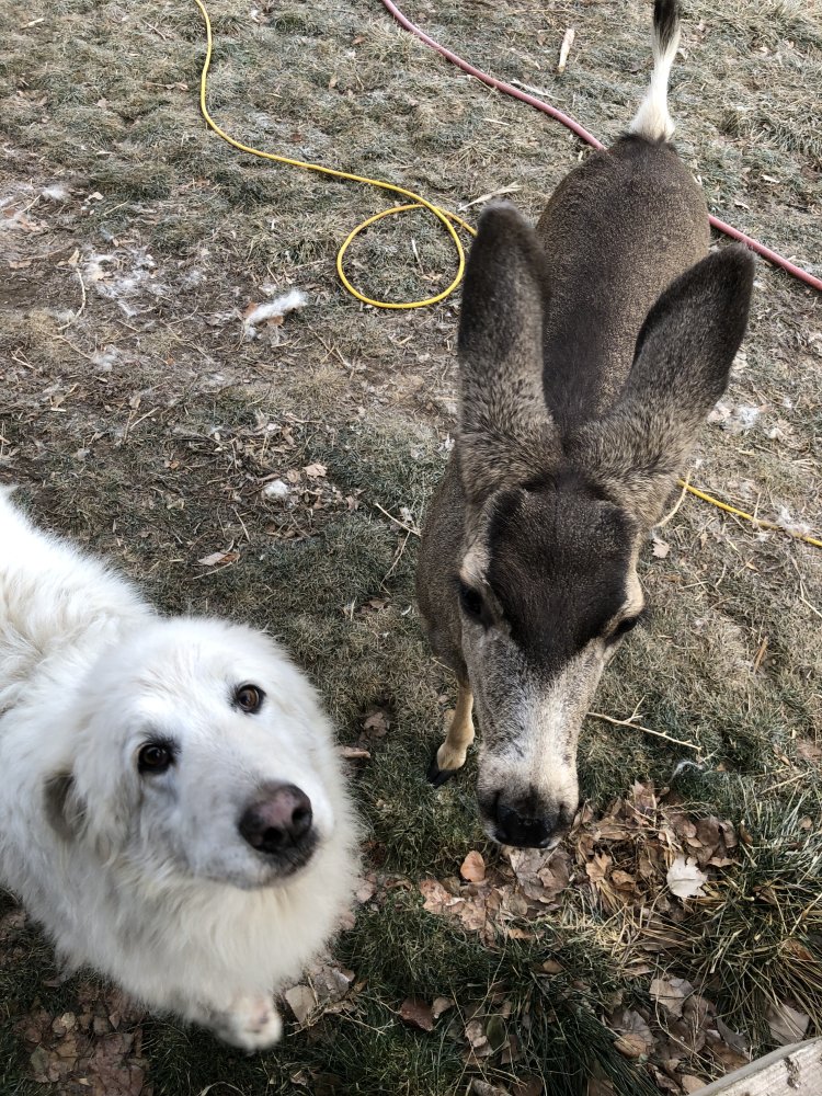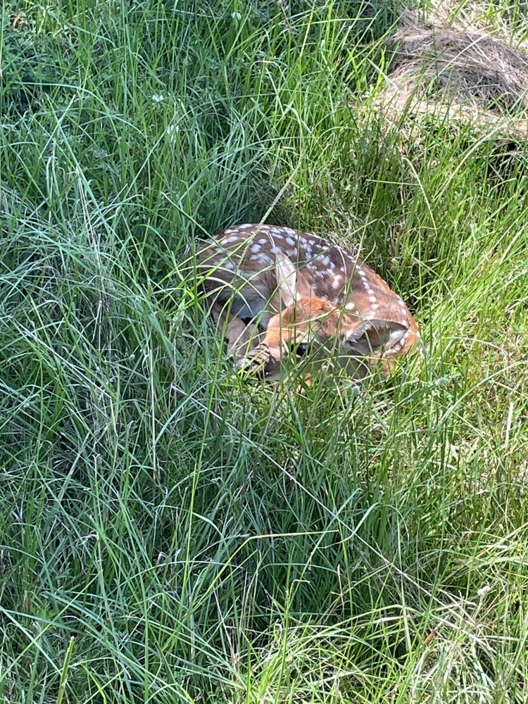 Sometimes they won’t run. They are pretty good about staying put when their mama’s go out to eat. One of the guys almost ran over one when he was cutting the hay. There was no where to move the fawn where its mama mwould be able to find him again without the coyotes getting him first. So he brought it here and we wound up bottlefeeding him. Mr. Potamus took him on as one of his charges. They always slept together and they became best friends. He lived in our backyard, ate all my raspberries and blueberries, and would jump the corral fence to graze in the 20 acre pasture for a year. Then Mr. Potamus died of old age, and Freddy left, and we never saw him again.