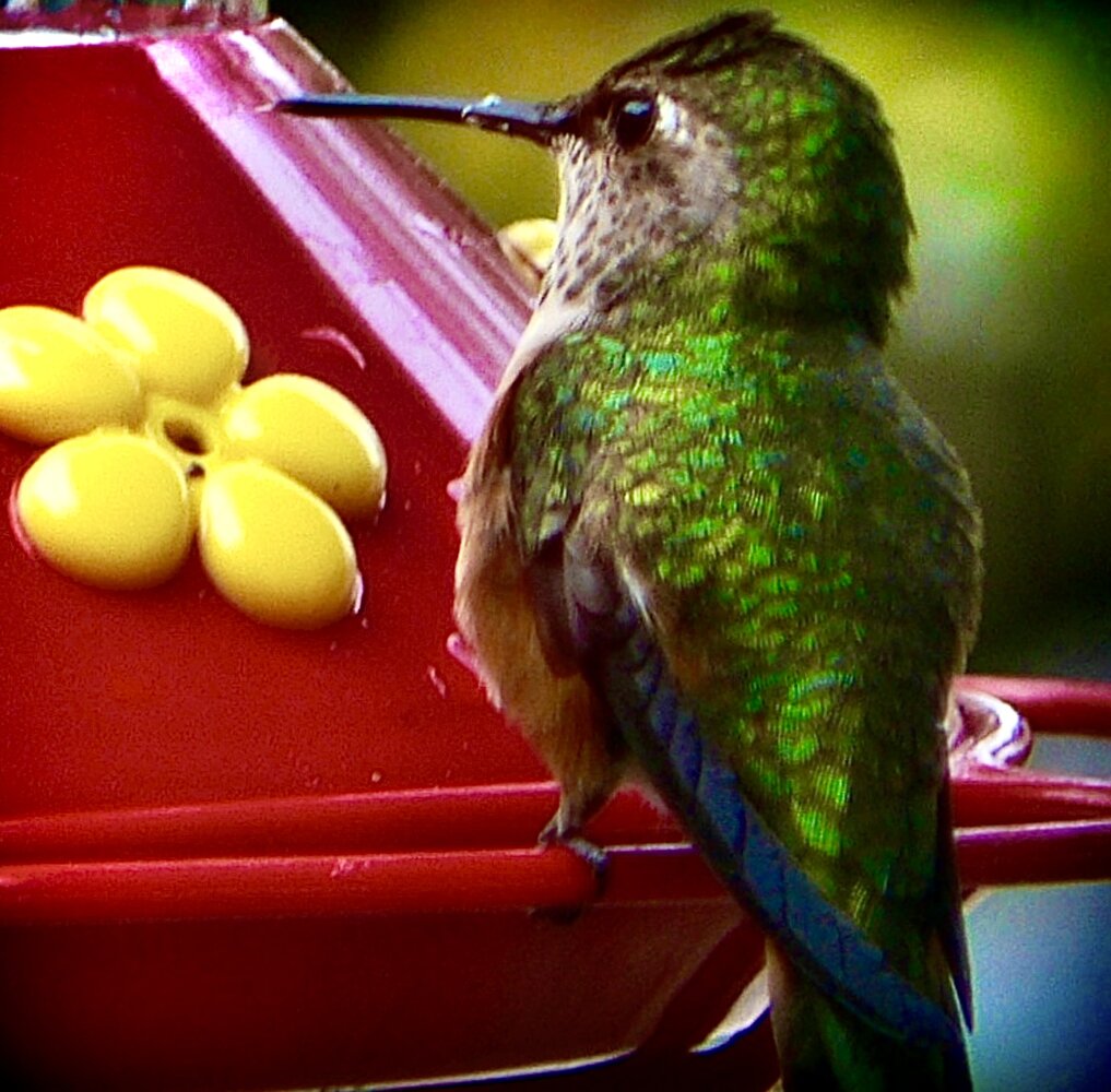 My little hummer buddy followers me everywhere when outside in the garden.. I named her Miss Poppy..I rescued her when she was just a baby was stuck in the feeder or fell asleep on the side bar.