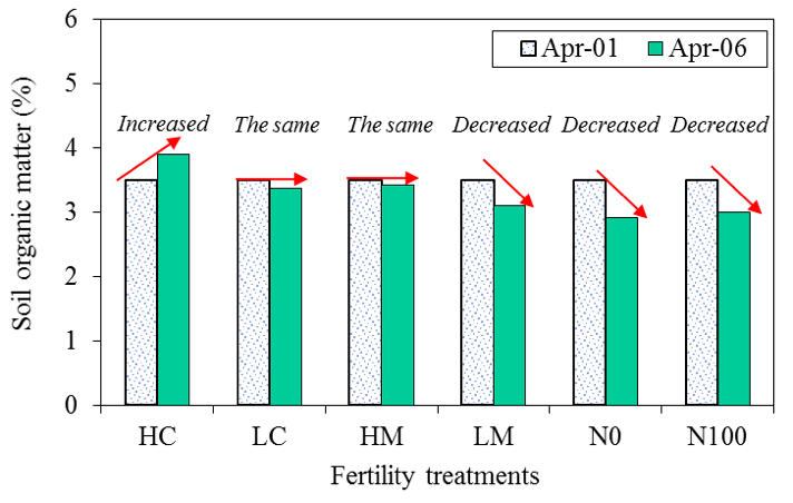 ig. 1: Soil organic matter. Treatments were HC: high rate of compost; LC: low rate of compost; HM: high rate of manure; LM: low rate of manure; N0: zero N control; and N100: 100 lbs sidedressed N/acre. This figure is comparing soil organic matter in April 2006 with soil organic matter in April 2001 for each fertility treatment.