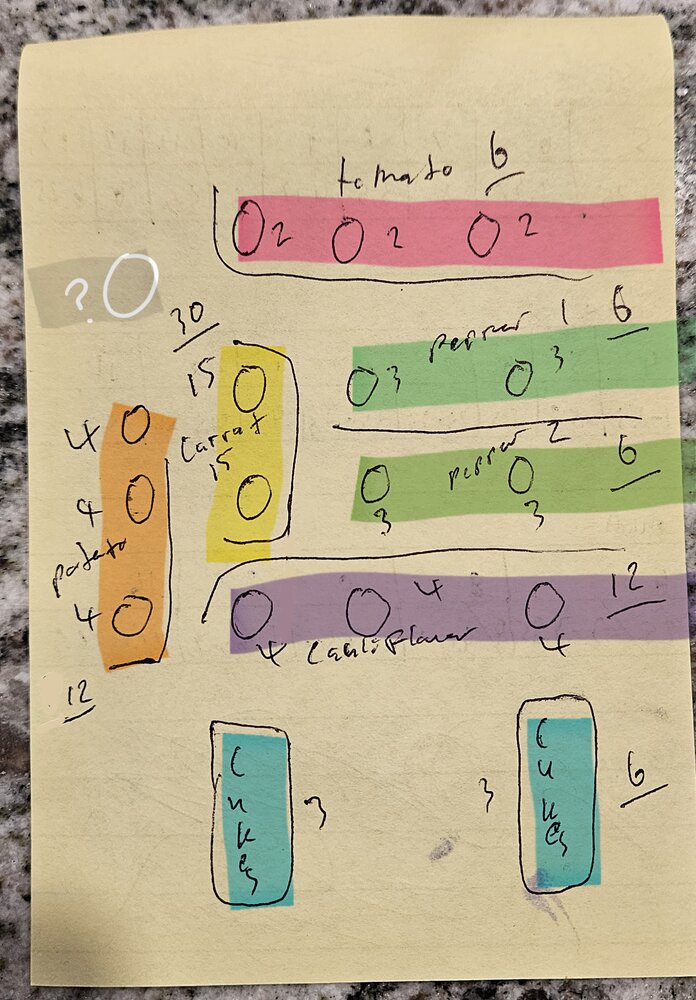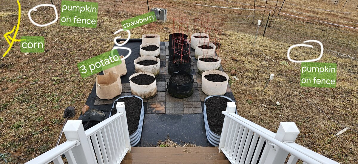 So, here's the latest plan. And corn added, too. I'll use a thick layer of the big pile of dirt for those to grow in. I don't want weeds, maybe use the cloth or cardboard and cut holes for the corn to poke out of? Hmm