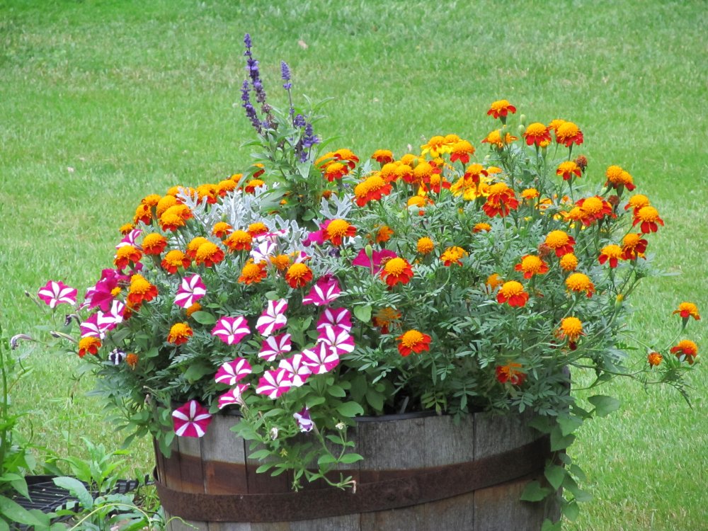 Here's my little entry container that I put on the lawn to give it a drink and a spraydown. It's leftover foliage plants, but they pulled together pretty well I thought.