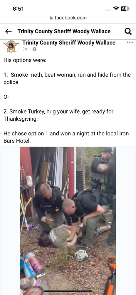Hey yall, this is a screenshot of our sheriff posting on FB. His droll humor is priceless. I’ve actually gone to visit friends and we watched his videos, laughing like a pack of hyenas. He puts it all out there. If yall are on FB, I highly suggest following his page.