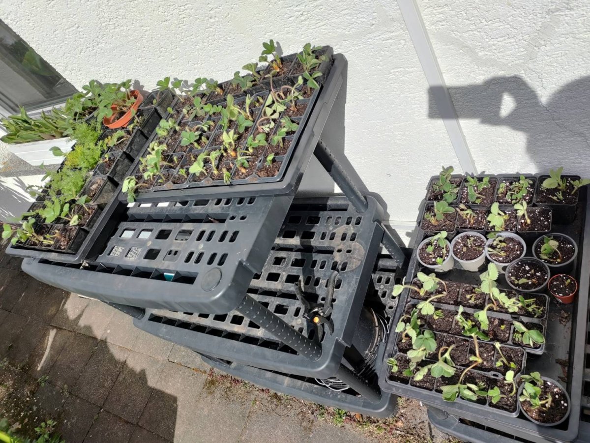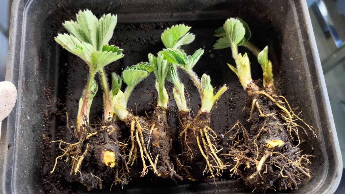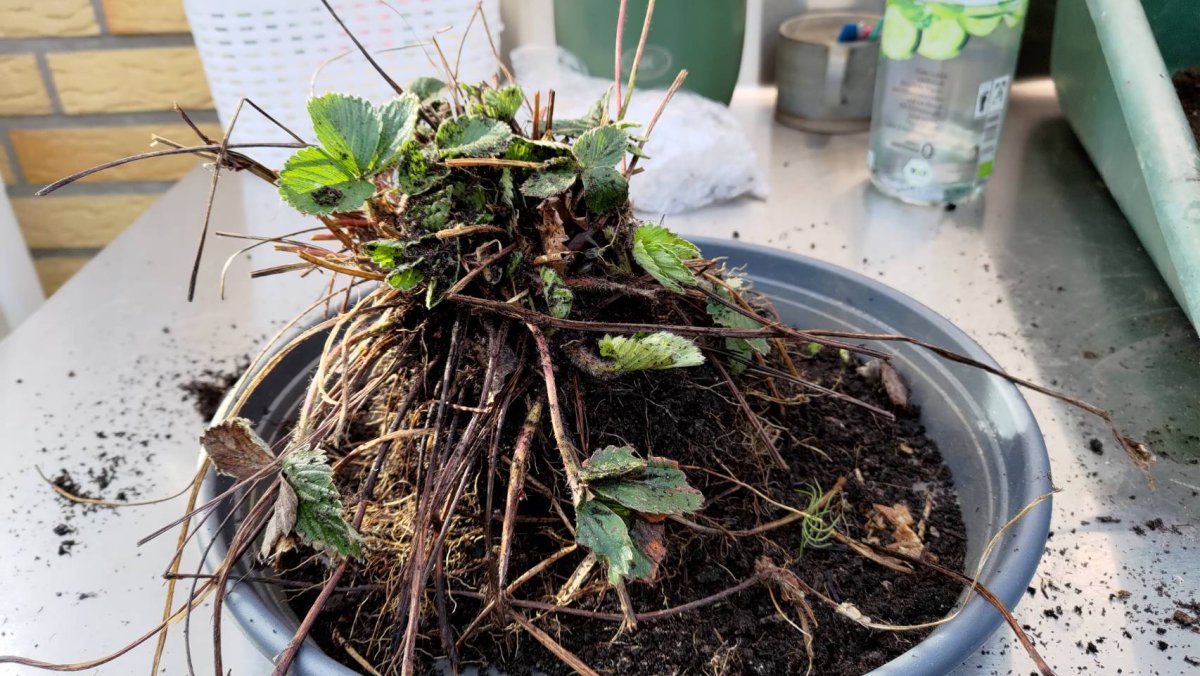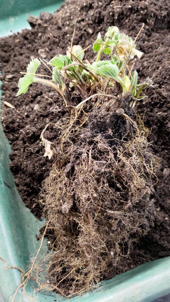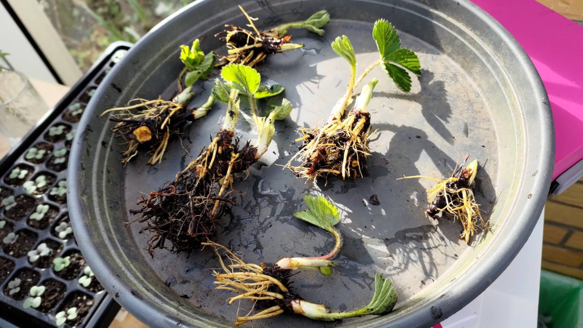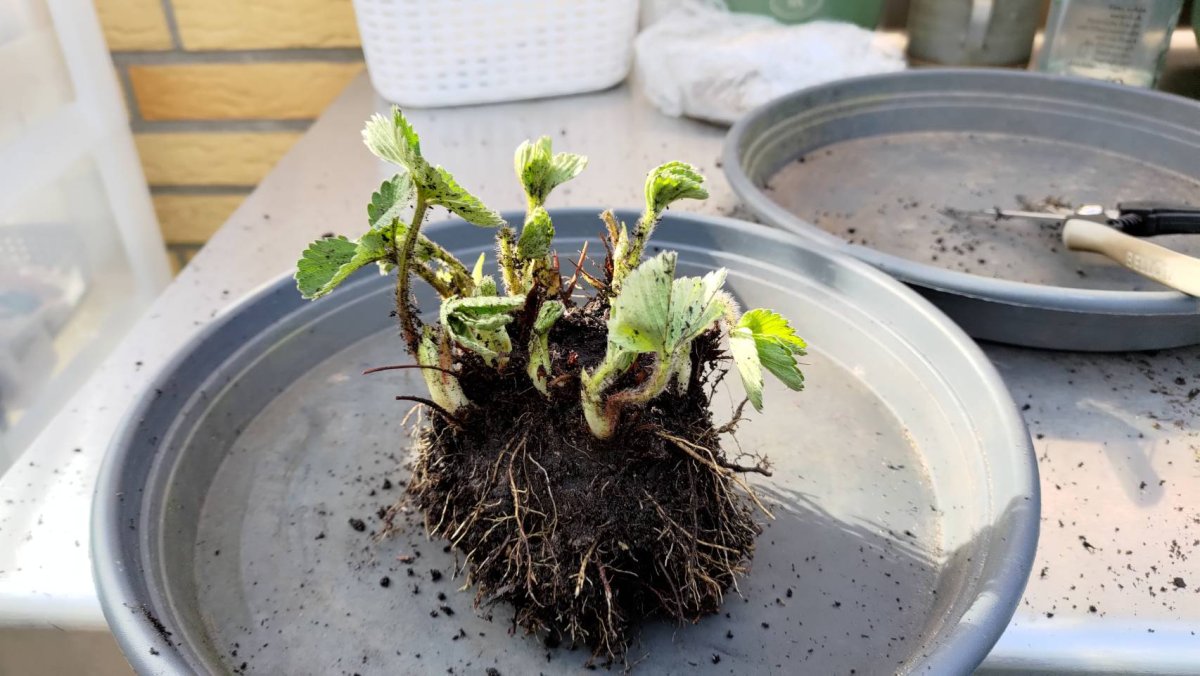 Last autumn, I cleaned all the strawberry plants in one raised bed, divided some larger crowns, and repotted them. Then I got 30+ new plants now. As the root systems are well developed, these new plants are going to some containers first.