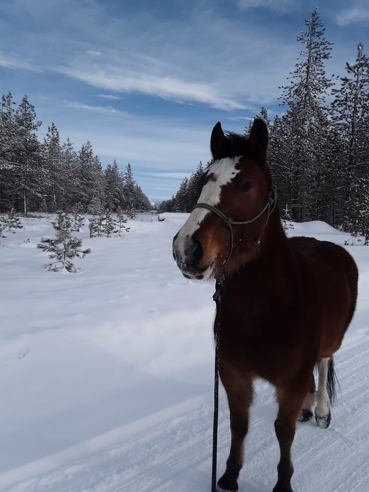 I lay there a second in the snow thinking she'd startle and take off. She stopped and lowered her head and looked at me as though she was wondering what this new cue was. Such a great little horse.