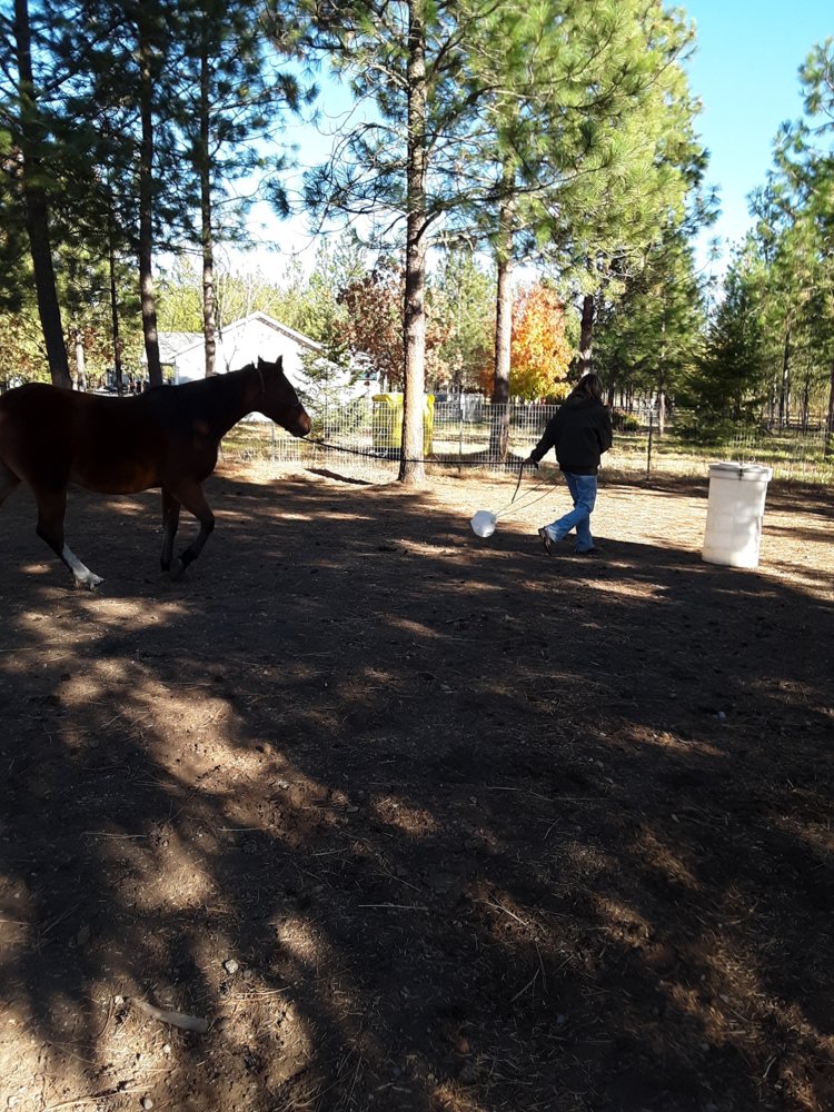 Here she is getting her accustomed to a scary object (grocery bag) and helping her build confidence.