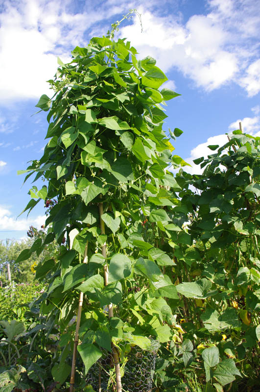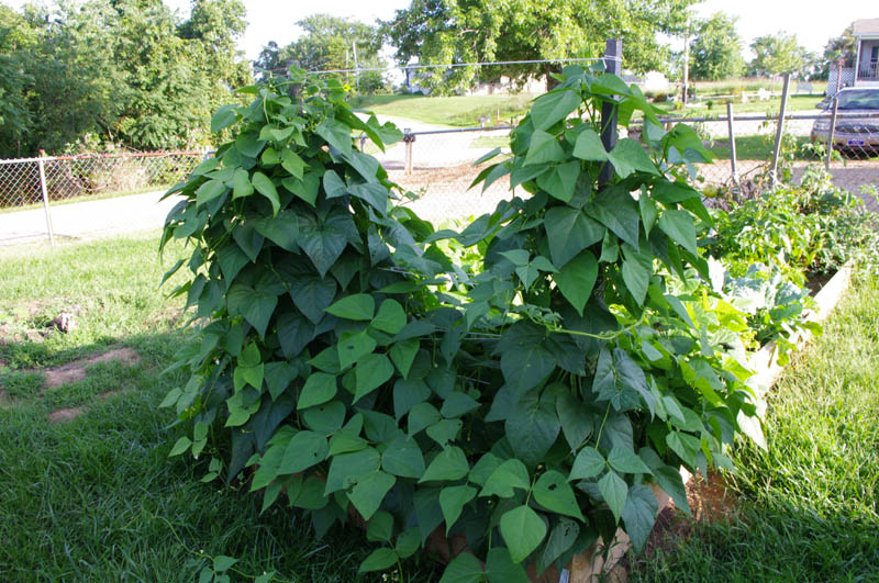 I ran out of bamboo poles and the raised bed planting was inadequately supported by comparison. That bunch is blooming now and the ones on the teepee have mature beans. I'll be canning some in the next day or two. :)