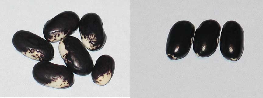 Rabbits Foot on the left this season threw off this black bean on the right that has this tiny spot of white at the ends of most of the seeds. Such a slight amount of white on the tips you could almost miss it.