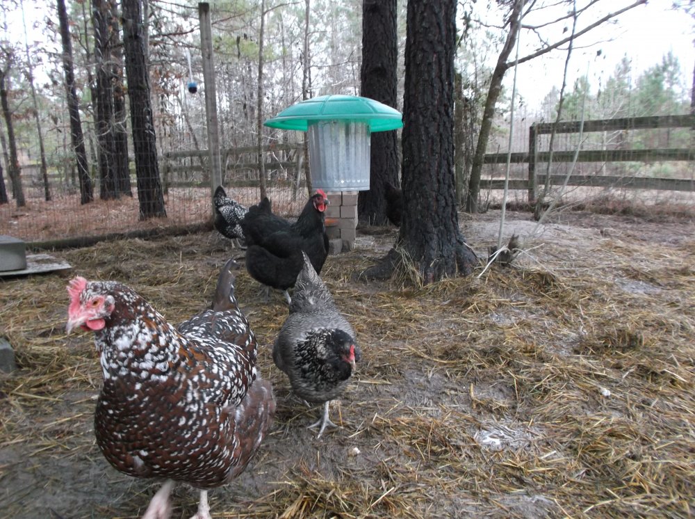 Okay, I also shovel a big area for them to mill around in where I throw their boss and scratch...but, they're pretty tough birds even so...:D