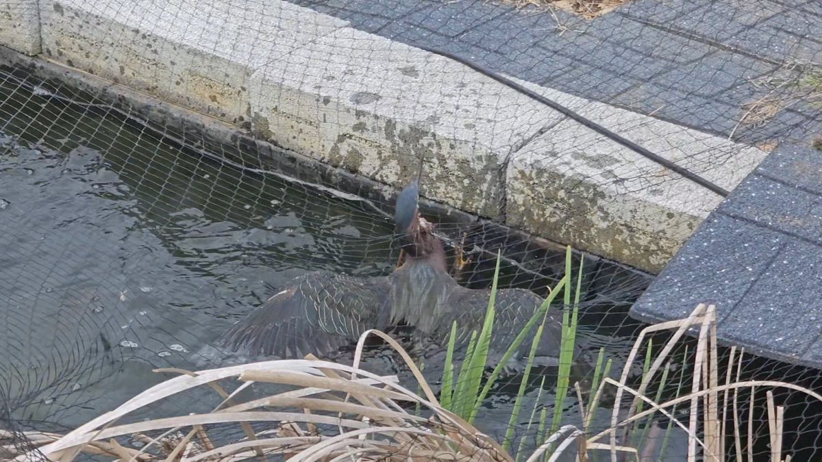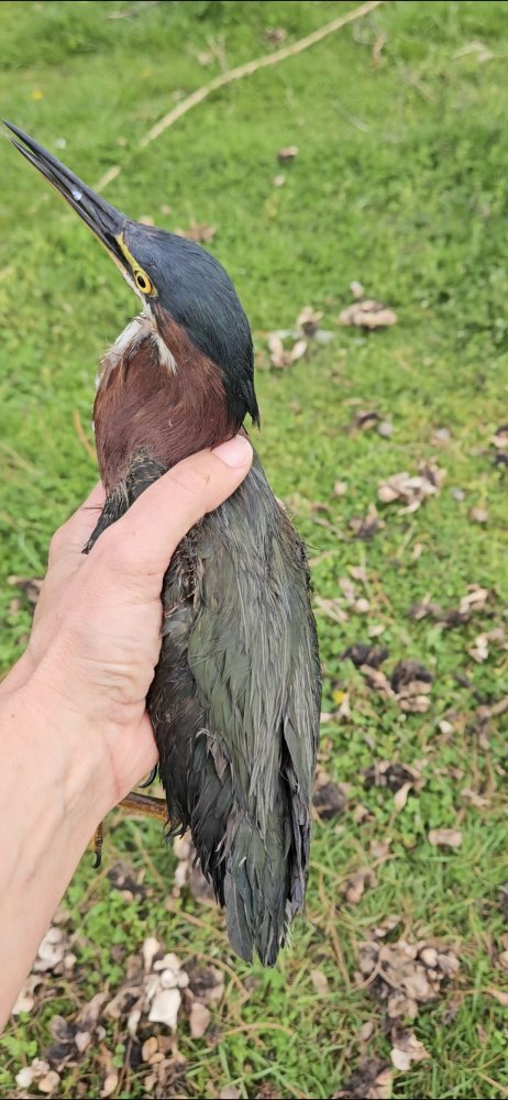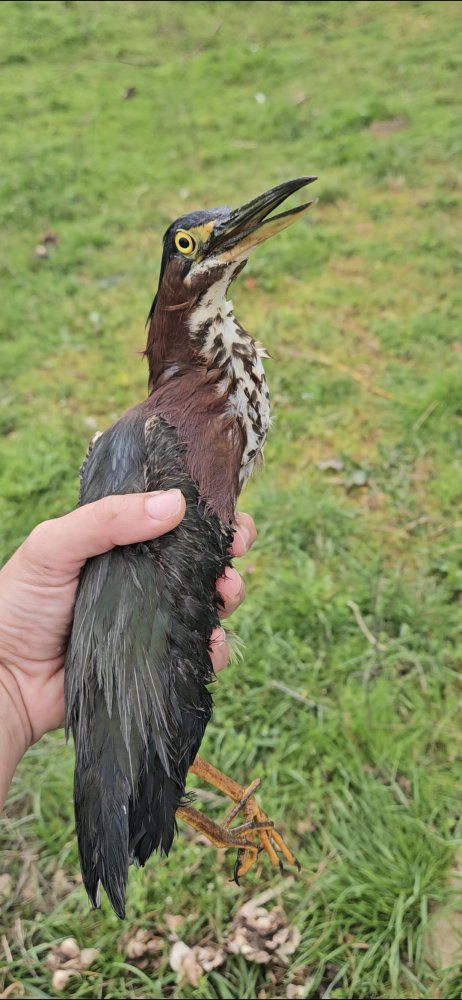 Green heron decided to try snacking in my pond. Got itself stuck and needing rescue. 🙄