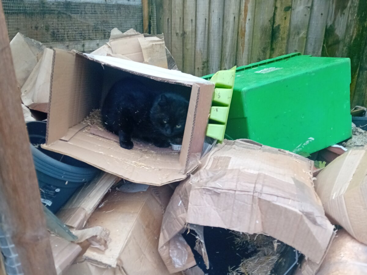 The feral Olivia has been sheltering in the worst drafty place and sleeping in a battered old cardboard box. So I felt as he insisted on being there I've tried to add a little plastic and my old loo seat to another cardboard box and I'm praying he's going to use it. I'm going to try and get a little kennel in there soon. It's getting very cold here now