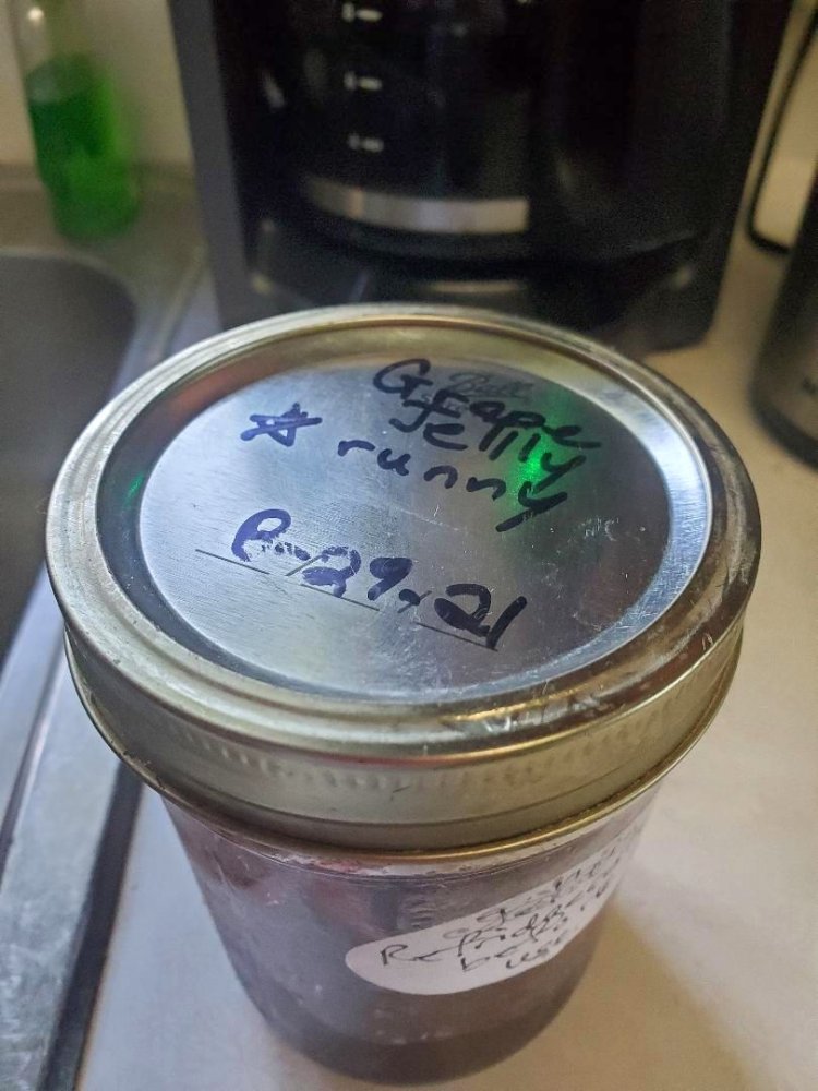 I discovered that when you can jelly, don't assume it didn't gel. Here is some grape jelly that I labelled, "runny," but it jelled perfectly after it sat in the pantry for several months. Yeah, we're going thought it.