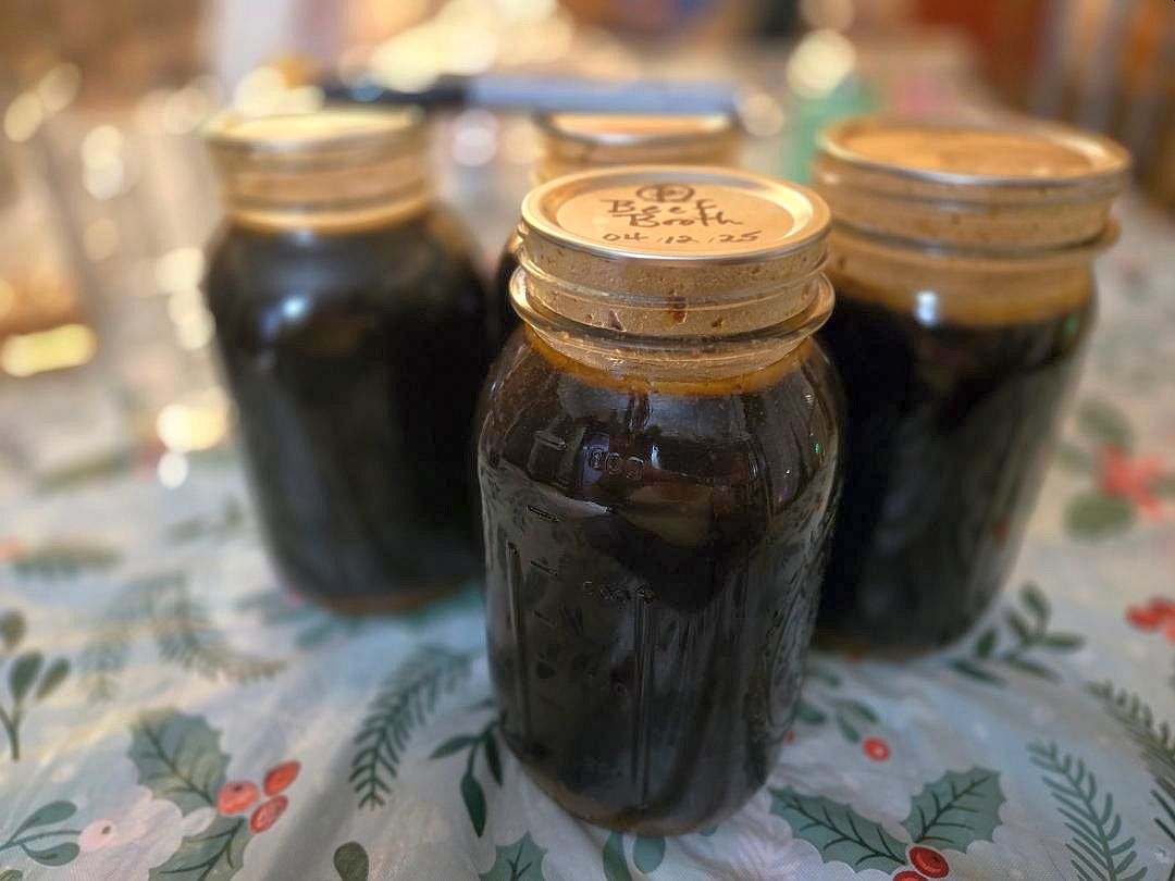 I am about to remove the pressure canner and it has 4 more quarts of deep and dark beef broth, made from making a roast on sunday with canned beef broth, adding back the leftover carrots and potatoes, adding a few dehydrated garlic pieces, adding 1/2 of an onion and frozen t bone steak bones, and adding some dehydrated tomatoes.