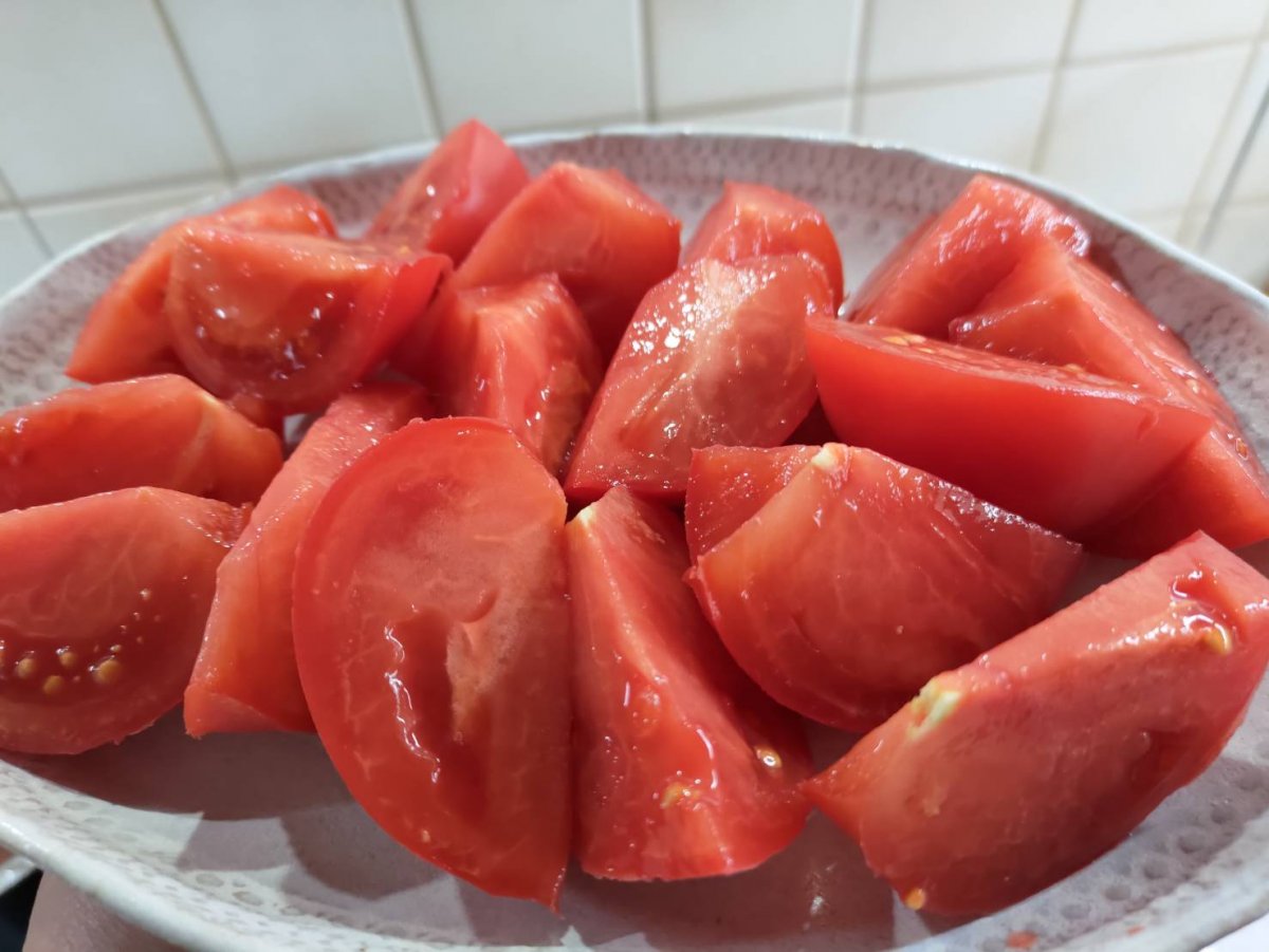 Many goodies from garden to eat today, a Japanese variety tomato, skin is thin and soft, as they are fully ripe on the plants, fully flavorful.