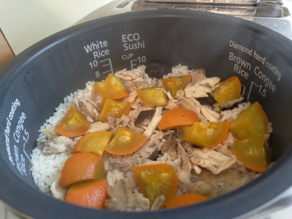 Some chicken broth left from lunch, so I used it, some mushroom and small pumpkins (some just didn't grow big successfully) to make them into a kind of 炊き込みご飯 .