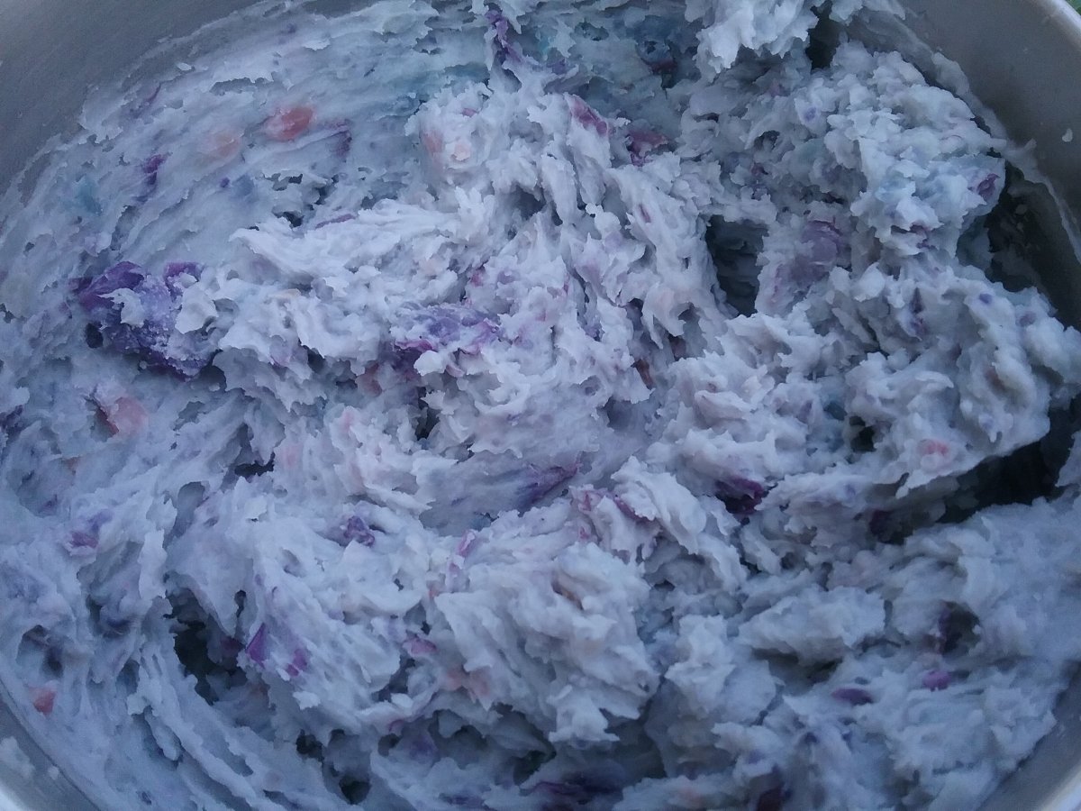 Purple/blue mashed potatoes. Colour didn't translate well to digital, but it looked like mashed Smurfs. Might look odd but the taste was exceptional. I forgot how good homegrown potatoes are.