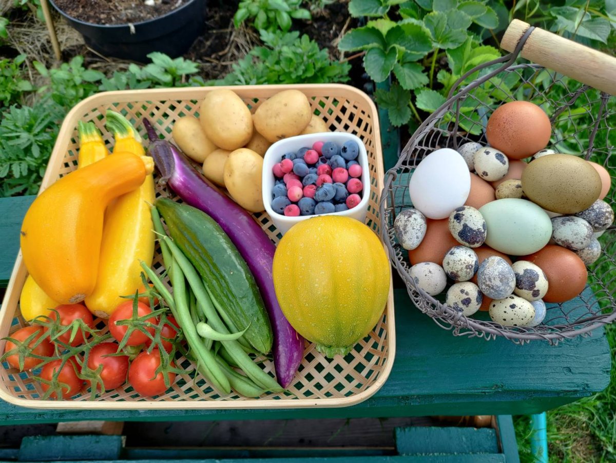 Harvest from both gardens - quail eggs and eggplant are from the small garden in Cologne, where the eggplants have a party.