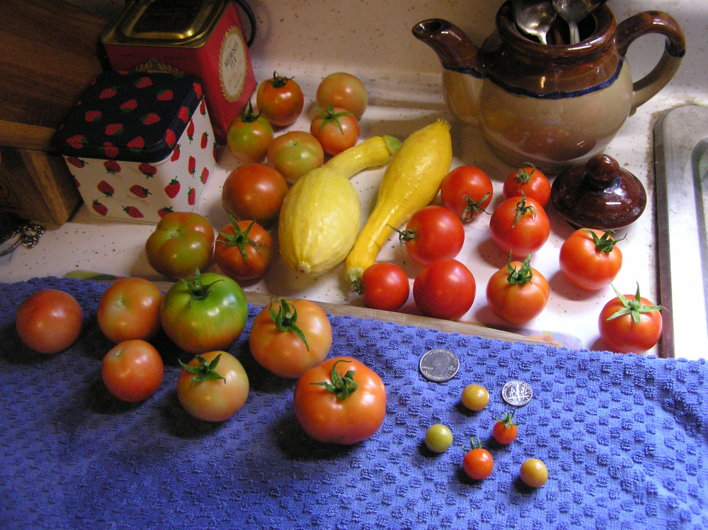 From my own little veg patch, I'm overrun with tomatoes (going to make salsa today) and more crookneck summer squash.