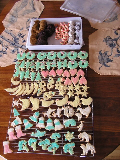 I like the broccoli and cheese ones.It is just the two of us here and we are not big into celebrating Christmas, but we are big into cookies! Every year I make a huge batch. Some go in the freezer, some go to friends or co-workers. With the frosted cookies, I do use a cookie cutter for some of the shapes, but I also like to use the negative shapes to come up with different creations. If you look carefully at the photo, you will see moldy Swiss cheese, broccoli spears, some odd birds and chickens, and other creatures.