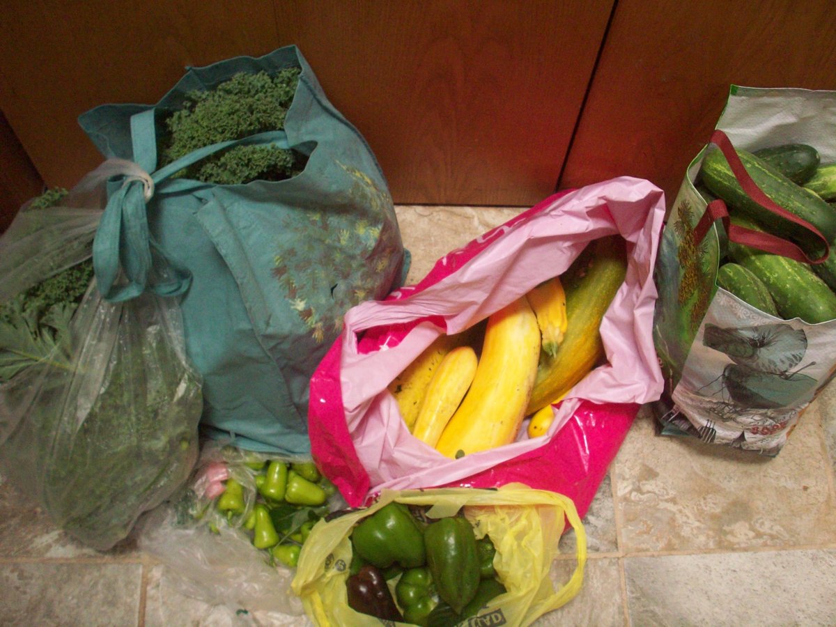 Here is this morning haul:View attachment 20844 There are 48 cucumbers in the Trader Joe's grocery tote on the right. 2 grocery bags of kale and more left in the garden. Only 7 zucchini this trip but 2 of them are very large. Those are the 1st peppers we got to pick before the DOG! LOL