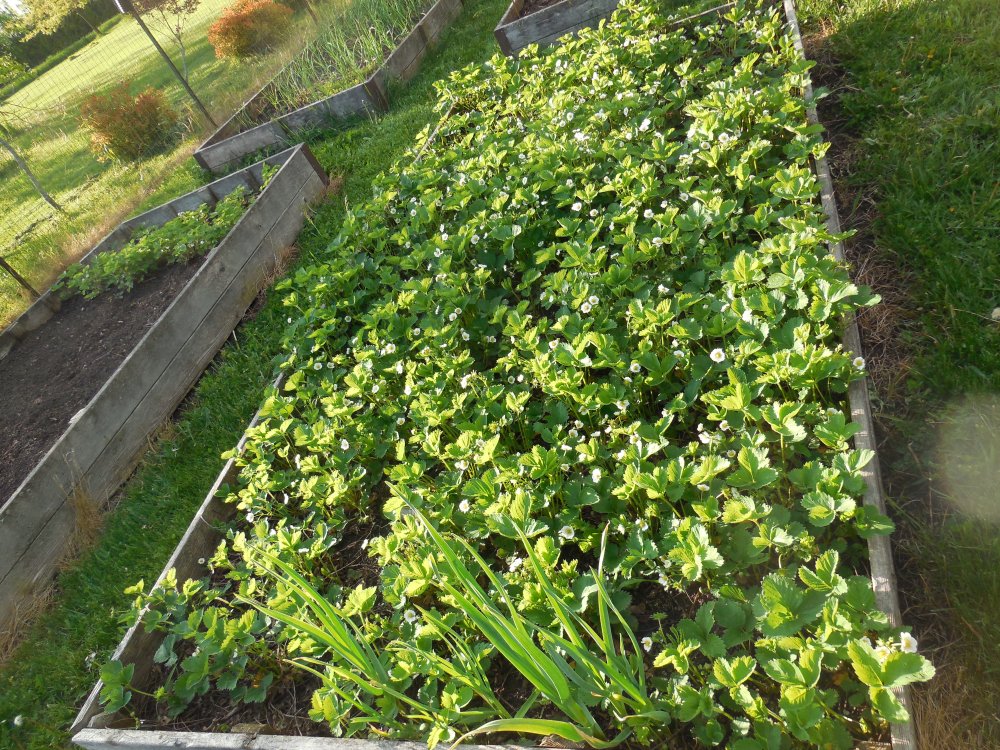 Doesn't the bed look great! Hardly a weed to be seen -- those few garlic scapes at the bottom don't count -- and the Alpine strawberries in the (mostly unplanted) bed to the left are looking just as good.