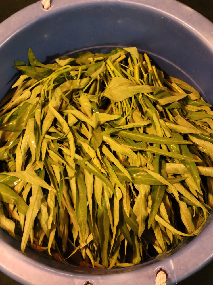 Water spinach. We'll save a little for ourselves, but will be giving much of this to our kids & some family friends. Sometimes we add the greens to mung bean soup, but mostly we eat it boiled & seasoned with soy sauce, vinegar, and garlic powder.